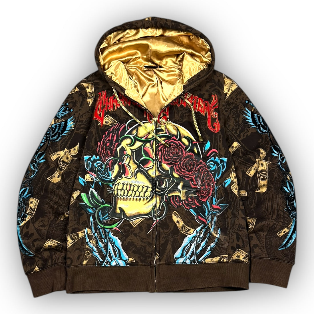 Christian Audigier Vintage Grunge Skull Zip Up Hoodie Size: L